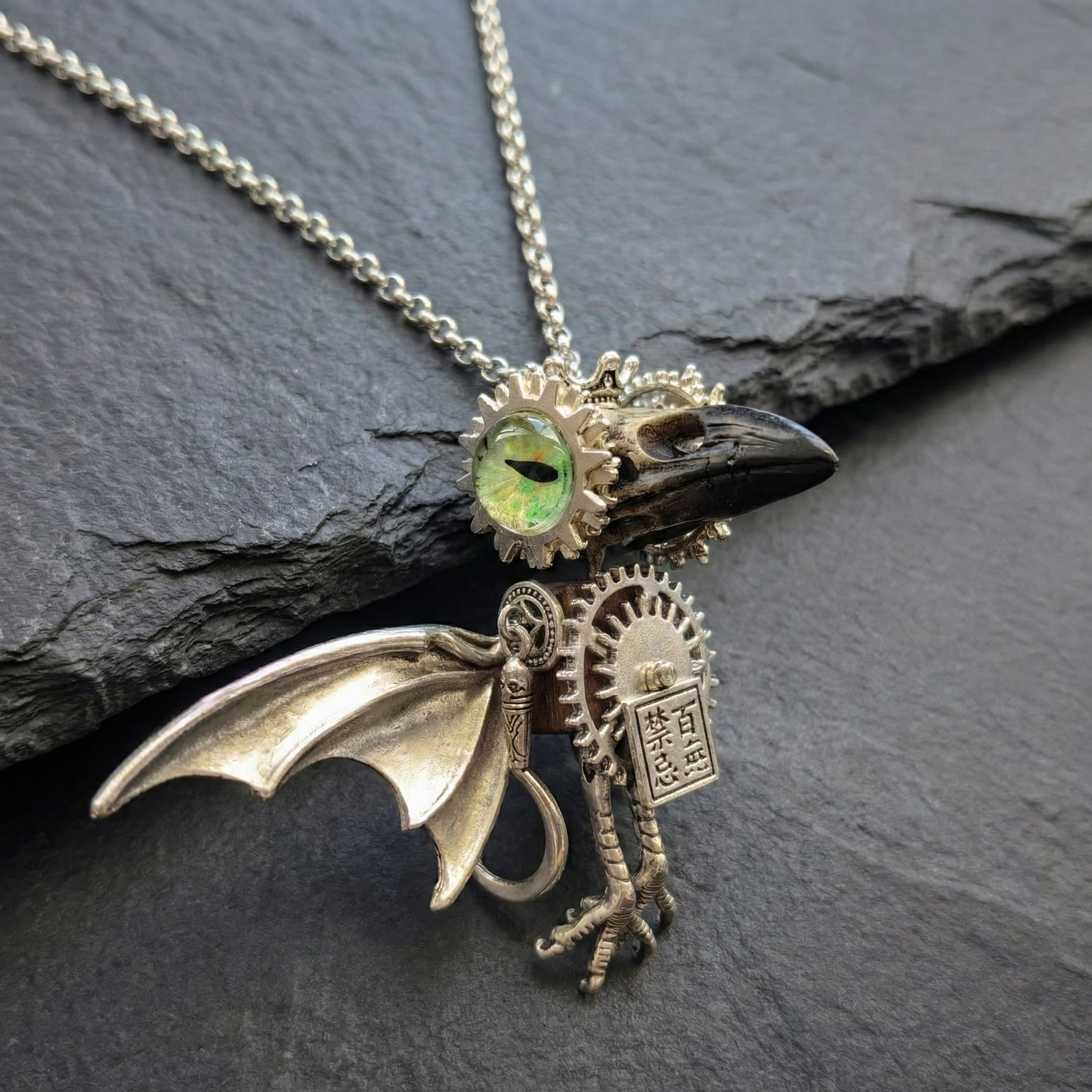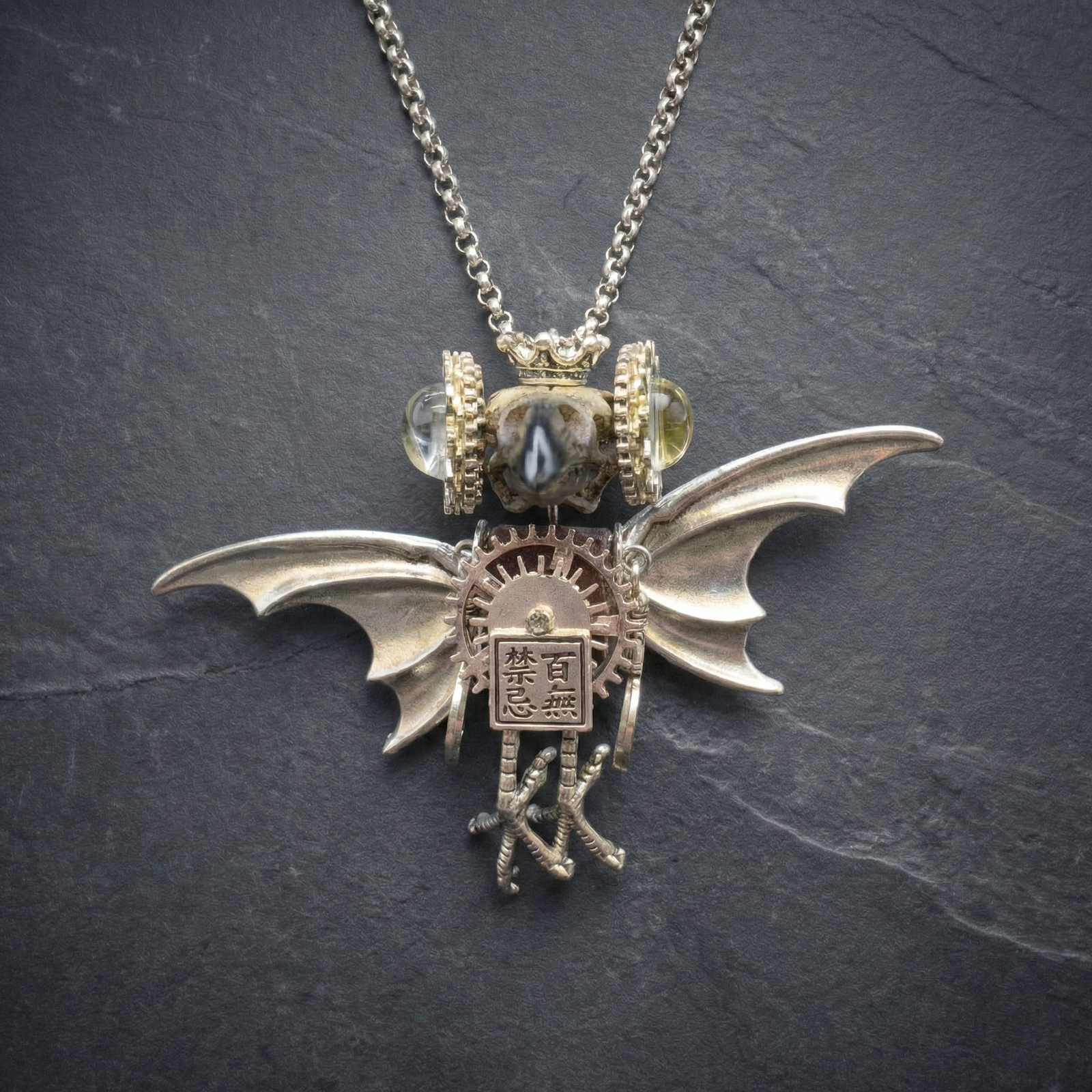 Manifest Wing – Sandalwood Mechanical Bird Skull Statement Necklace | Avant-Garde Art Jewelry