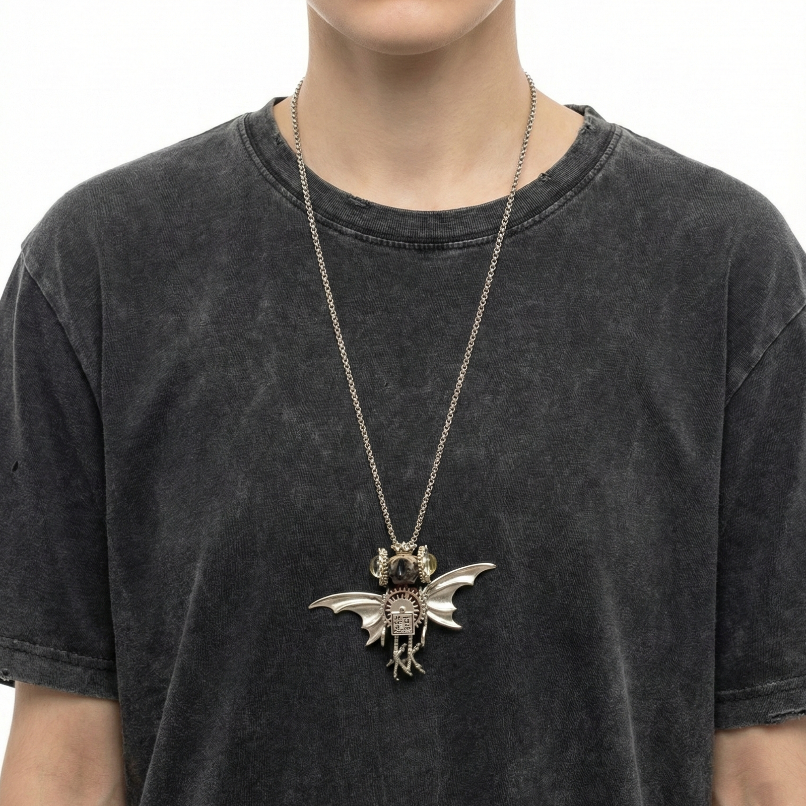 Ascending from the “Realm of Sky” series, this avant-garde centerpiece is named the “Manifest Wing.” It fuses organic sandalwood with precision steel gears and hand-painted glass eyes. Anchored by the “No Taboos” (百無禁忌) badge, it reminds you that desire has no boundaries, transforming fantasy into a masterpiece you can finally hold.