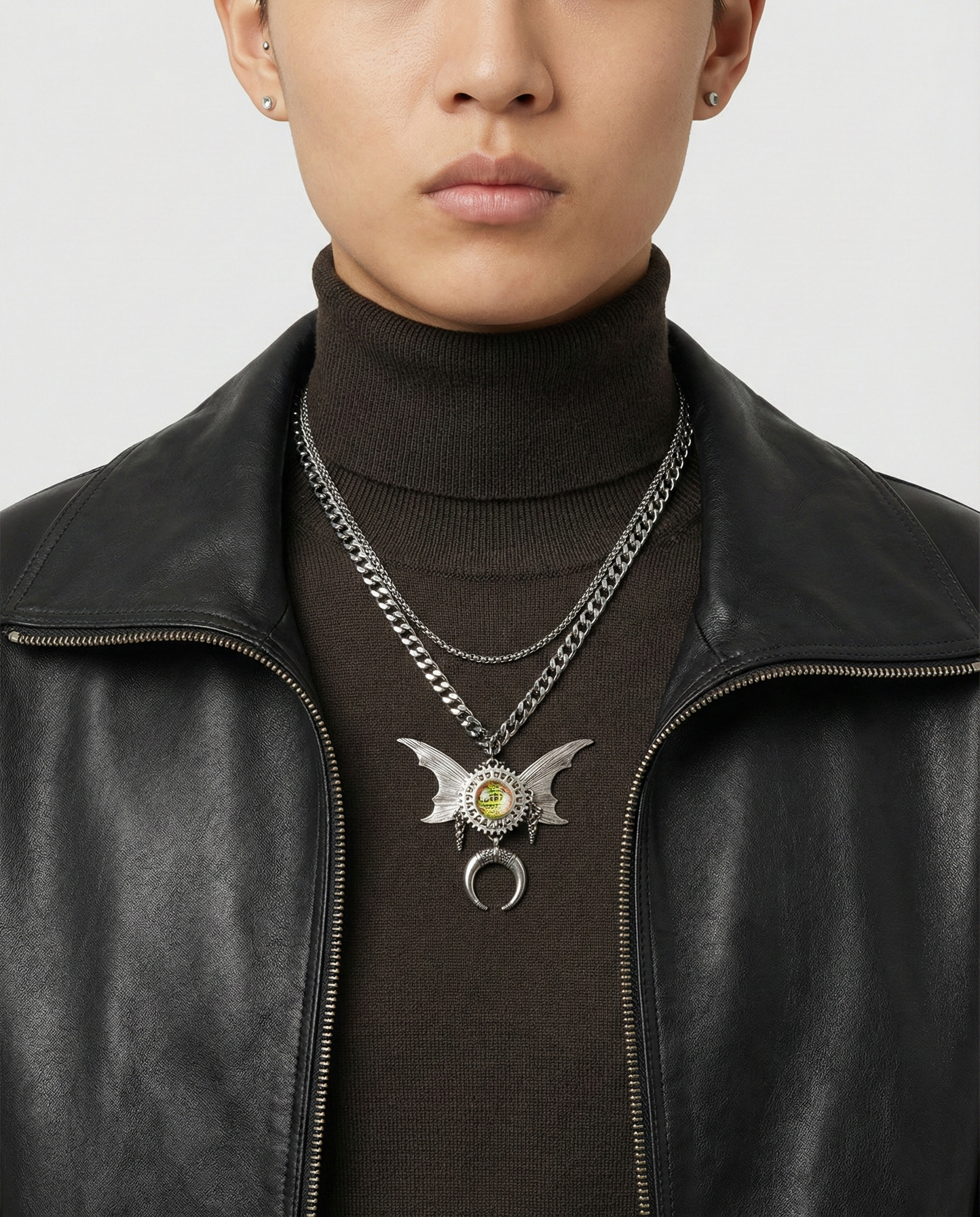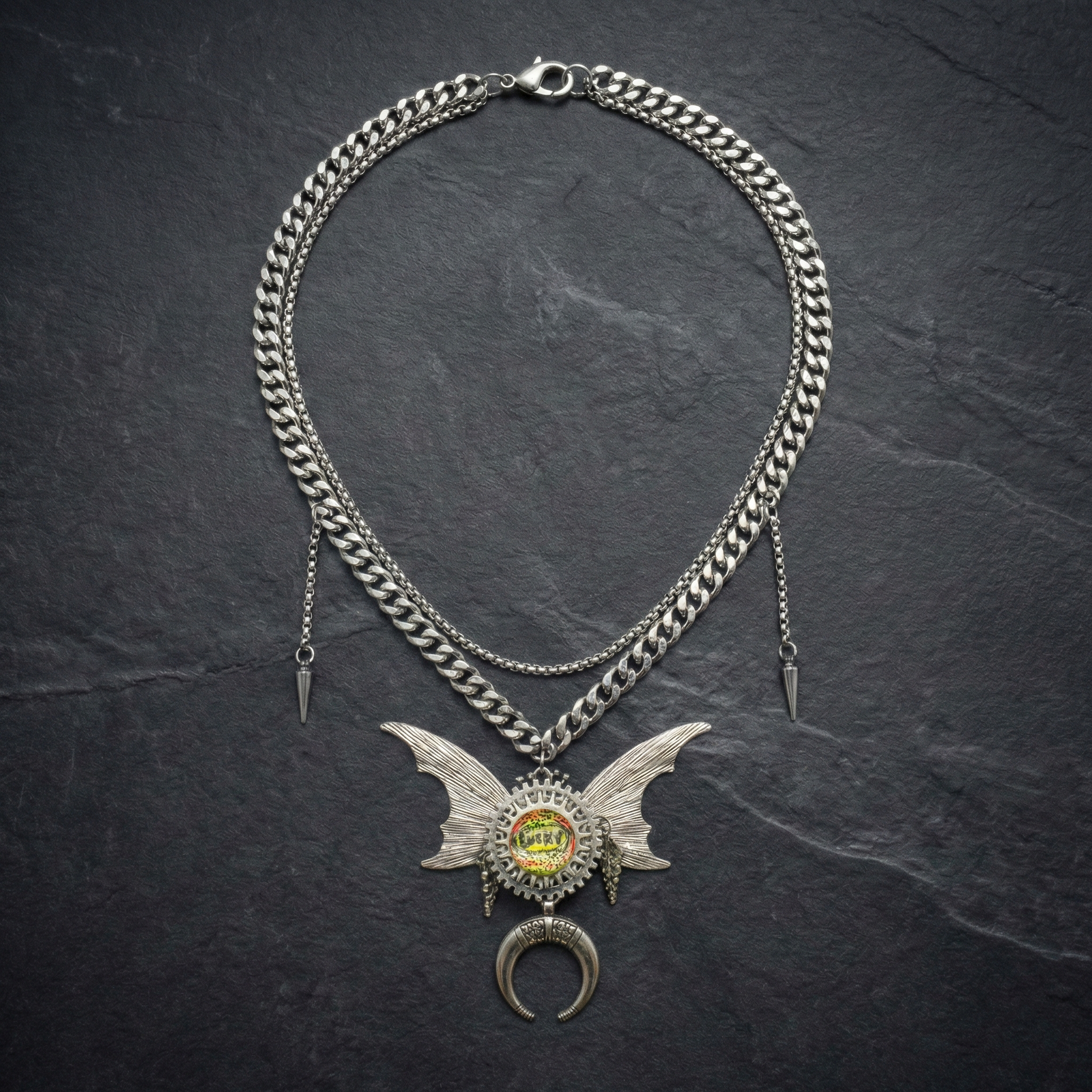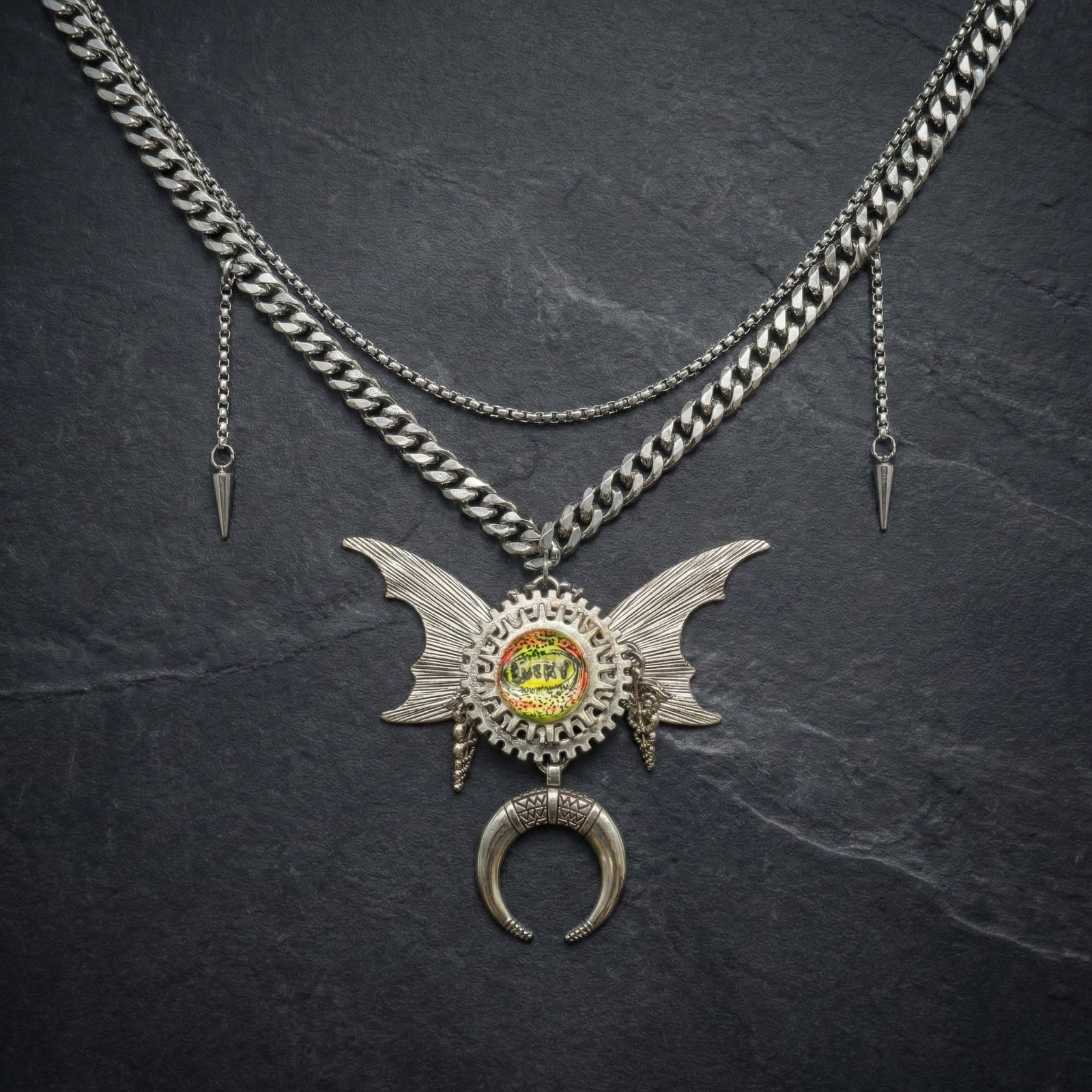 Forged with a raw Industrial Grunge aesthetic, this pendant features a bio-mechanical butterfly centering a hand-painted graffiti ‘LUCKY’ eye. The distressed silver wings frame the gaze, accented by a suspended textured crescent moon and rebellious spike charms on the chain. A variation of “The Wing of Severance,” it symbolizes Severing Misfortune. Wear it as a sigil for Active Manifestation. It reminds you that luck isn’t found—it’s seized by cutting ties with the past and rewriting your own fate.